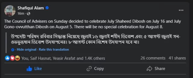প্রধান উপদেষ্টার প্রেসসচিব শফিকুল আলম নিজের ভেরিফায়েড ফেসবুকে এ তথ্য জানিয়েছেন। তিনি লিখেছেন, উপদেষ্টা পরিষদ ১৬ জুলাই শহীদ দিবস এবং ৫ আগস্ট গণ-অভ্যুত্থান দিবস উদযাপনের সিদ্ধান্ত নিয়েছে। ৮ আগস্টের জন্য কোনো বিশেষ উদযাপন হবে না।